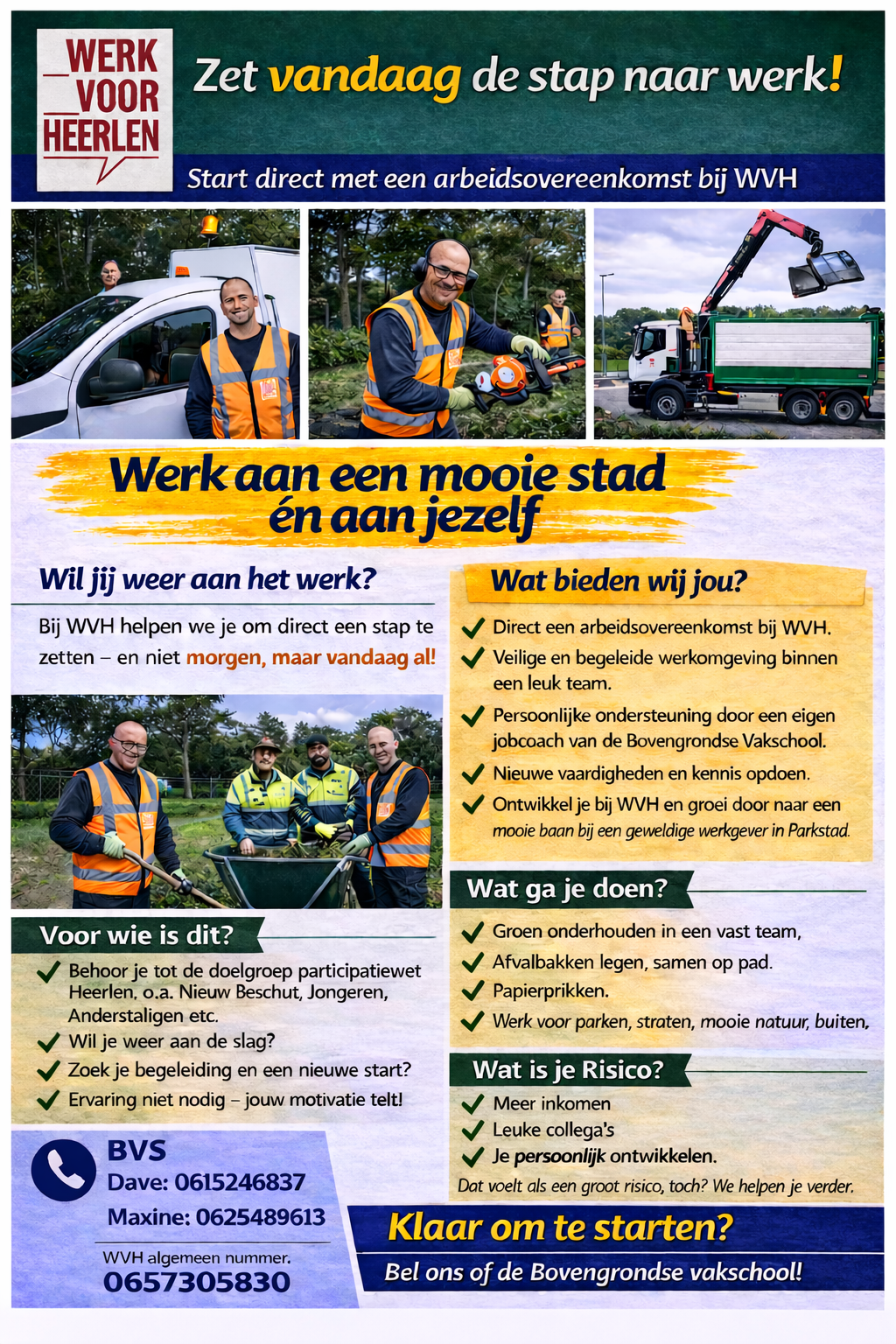 Stichting WerkvoorHeerlen is een groenbedrijf met een maatschappelijke opdracht. In opdracht van de gemeente Heerlen onderhouden wij de openbare ruimte én bieden we inwoners uit de Participatiewet, WSW, Nieuw Beschut en jongeren de kans om werkervaring op te doen, vaardigheden te ontwikkelen en voor kandidaten uit de participatiewet de kans door te groeien richting regulier werk bij een externe werkgever. We werken buurtgericht en combineren vakmanschap met sociale impact: zichtbaar resultaat in de stad én groei voor mensen.